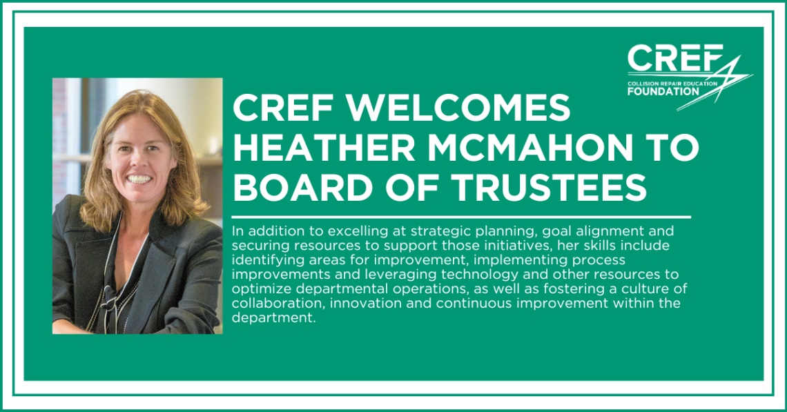 “The Foundation is delighted to have Heather join our Board of Trustees,” says CREF Executive Director Brandon Eckenrode. “Her industry experience and her passion for promoting education will certainly be a major asset. I look forward to her joining in CREF’s efforts to support collision school programs and students.”
